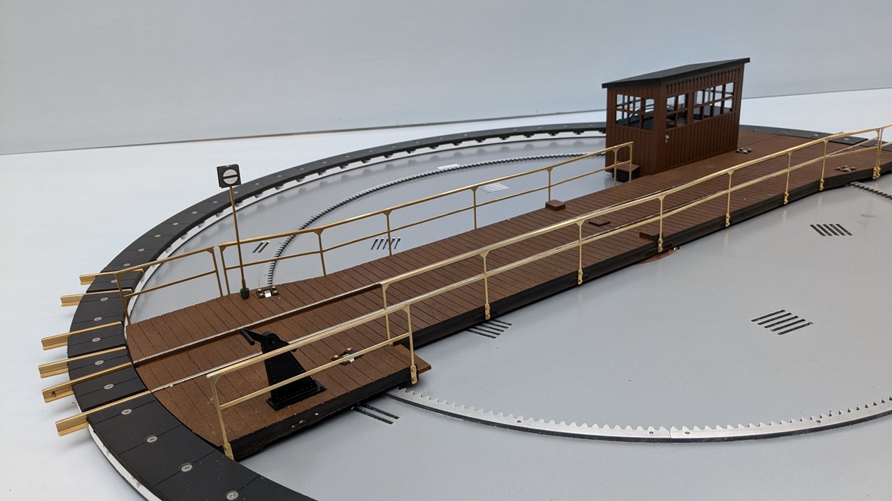 Details der Drehbühne sind unter anderem Sperrsignal, nachgebildeter Handantrieb, Messinggeländer und Wärterhaus.