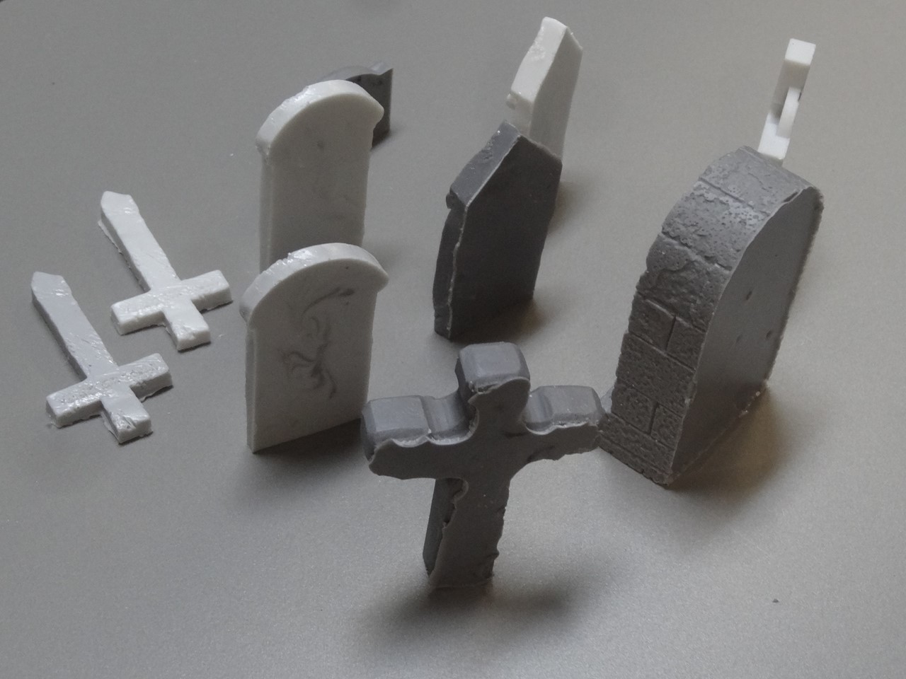 Der Set besteht aus einer Madonna in einer Steinnische, einem großen Kreuz mit Kruzifix, einem Kreuz mit Ring und 7 weiteren Grabsteinen. Diese sind farblich gemischt, sodass ein abwechslungsreicher kleiner Friedhof gestaltet werden kann. Die Bauteile werden mit unseren Jigstones-Formen 40305 und 40307 hergestellt. Wer also viele solche Steine haben möchte, kann sich diese mit unseren Formen auch selbst herstellen.
