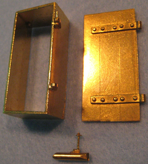 Die Werkzeugkiste besteht aus drei Teilen: Das Gehäuse, der Deckel und ein Niet, mit dem der Deckel dann am Gehäuse befestigt wird. Er kann eingeklebt oder eingelötet werden.