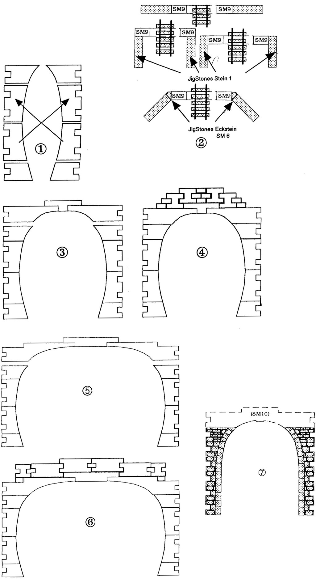Ergibt drei Elemente für den oberen Bogen eines zweispurigen Tunnels. Die einzelnen Steine werden wie in Zeichnung (5) dargestellt zusammengefügt. Das fertige Tunnelportal sollte ebenfalls wie in Skizze (6) gezeigt mit einigen Steinen aus der Form SM 1 / SM 2 auf der Oberseite ergänzt werden, damit sich ein vorbildgetreuer Gesamteindruck ergibt.